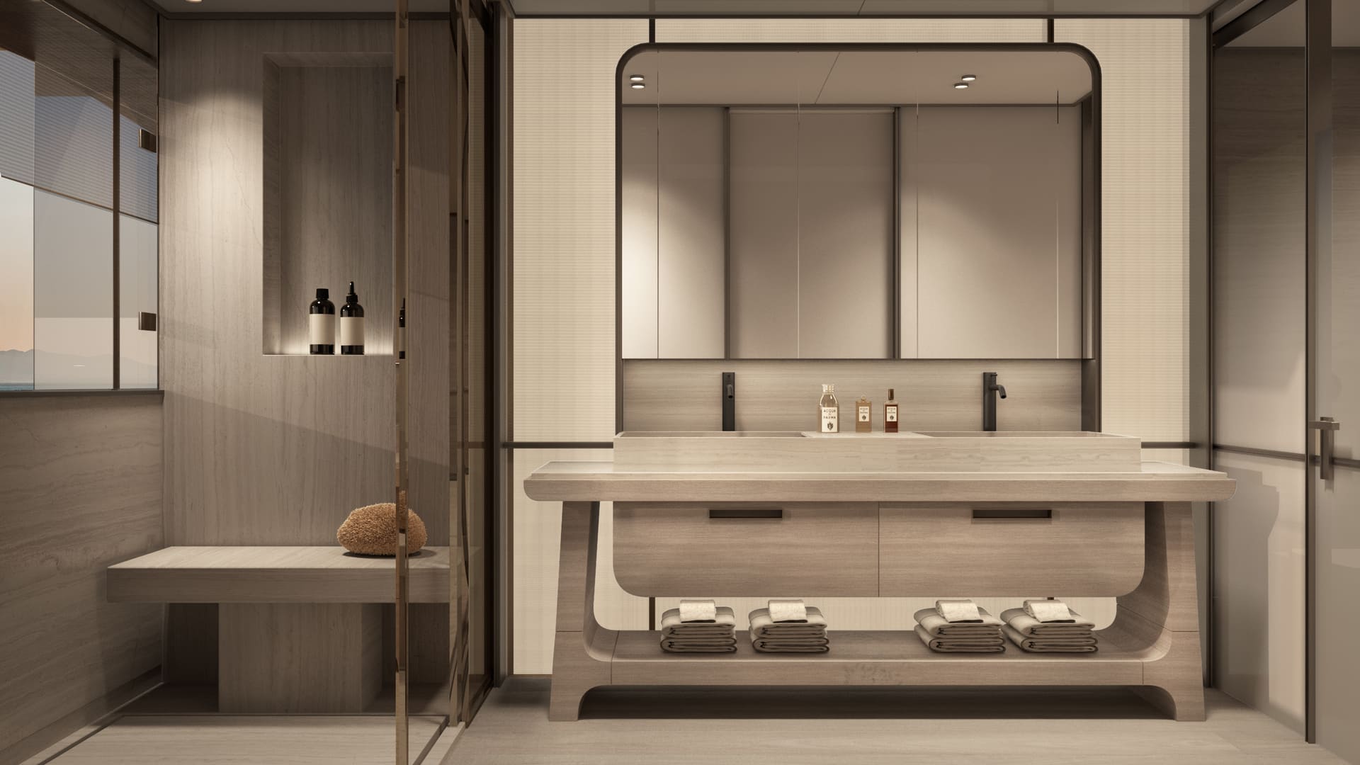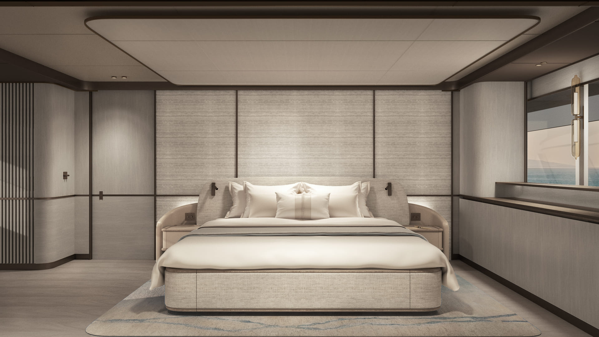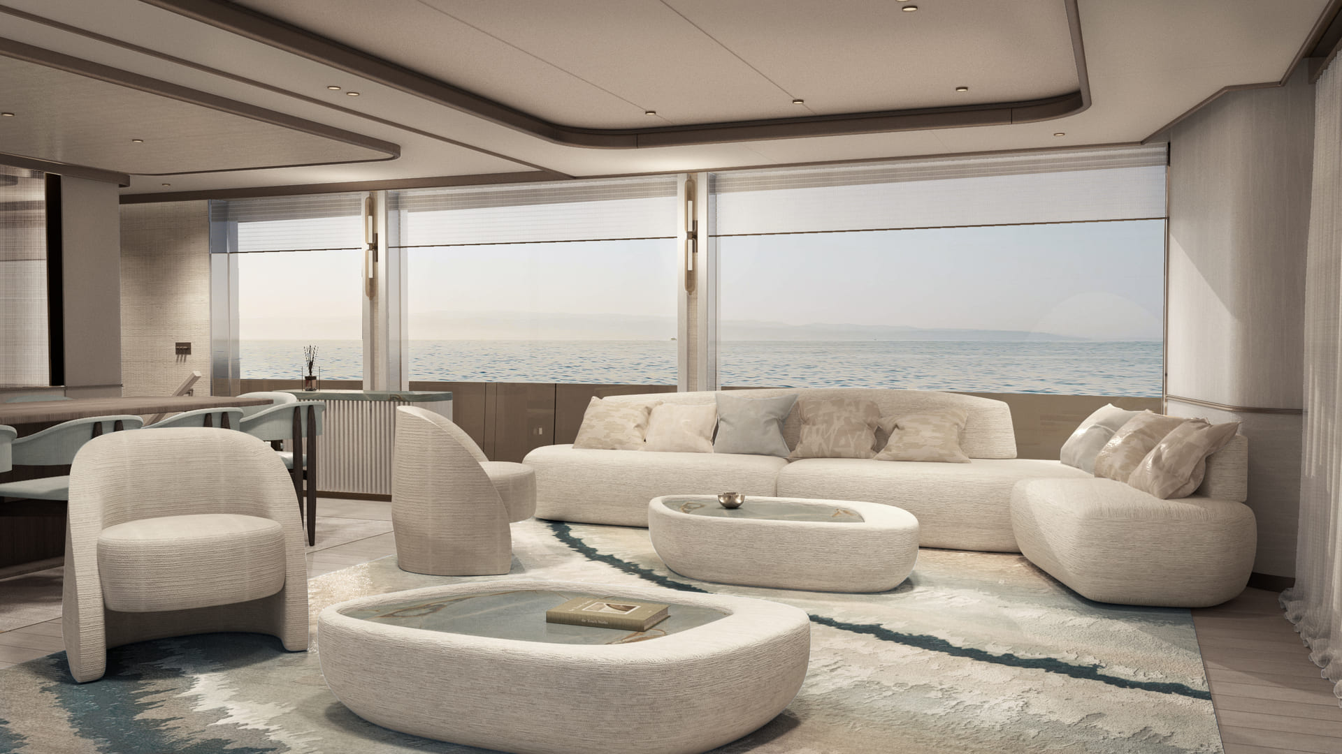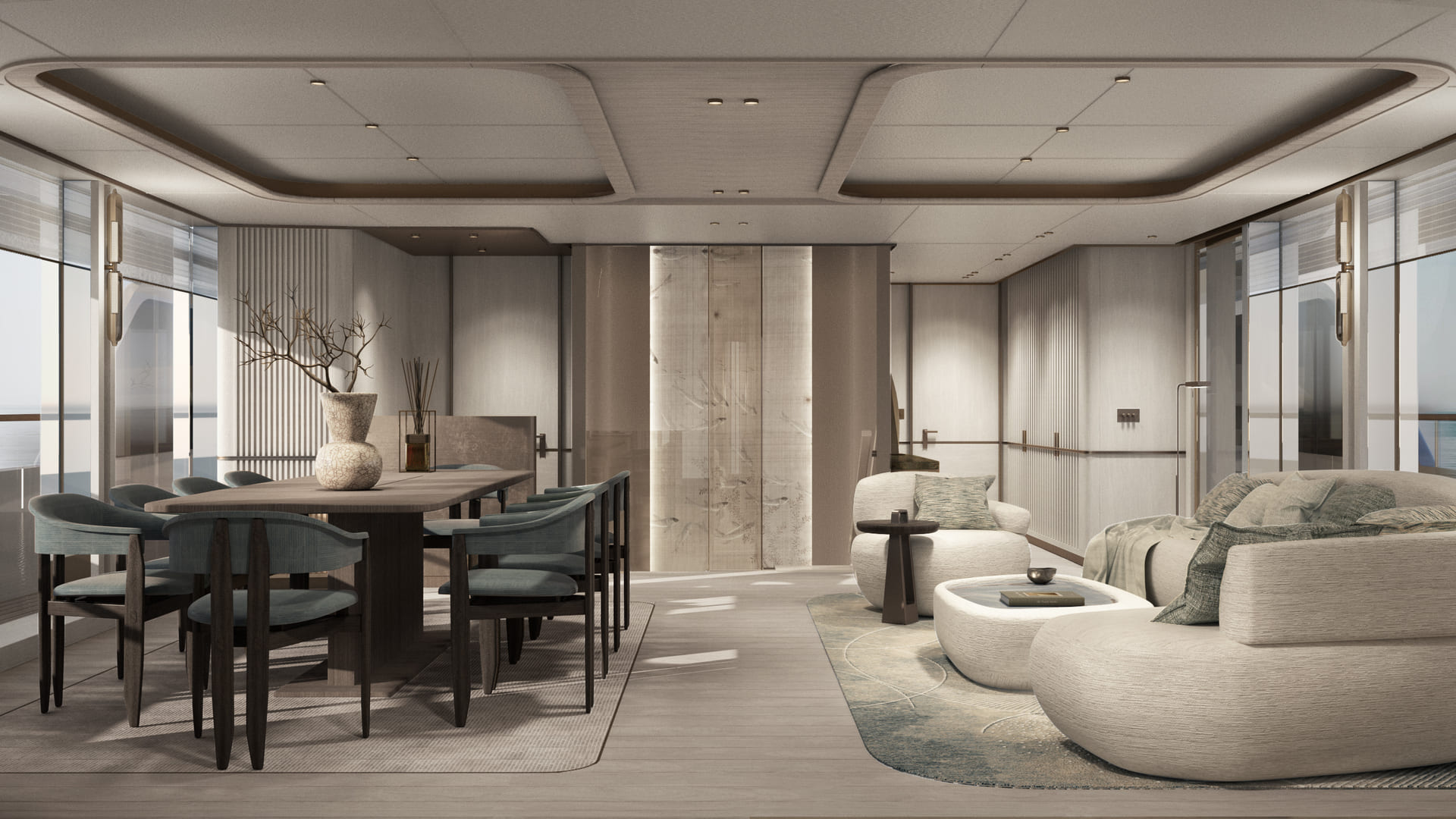 Nolimits超级游艇操刀的室内设计个性鲜明,与海洋元素和谐共鸣。从空间布局、选材用料到纹理刻画无不致敬自然之美,自然光线的引入更成为了别具一格的点睛之笔。犀利的几何元素与柔和的弧形元素相互交织,前卫的几何建筑与典雅的雕塑家具相映成辉,呈现出和谐与平衡之美。在选材方面以天然材料为主,特别是采用了突显艺术纹理和颗粒感的木材,以及折射光泽质感的拉丝金属、亚麻织物及丝绸壁纸。每处环境阴阳相成,每处细节引人入胜,见微知著彰显名不虚传的魅力。