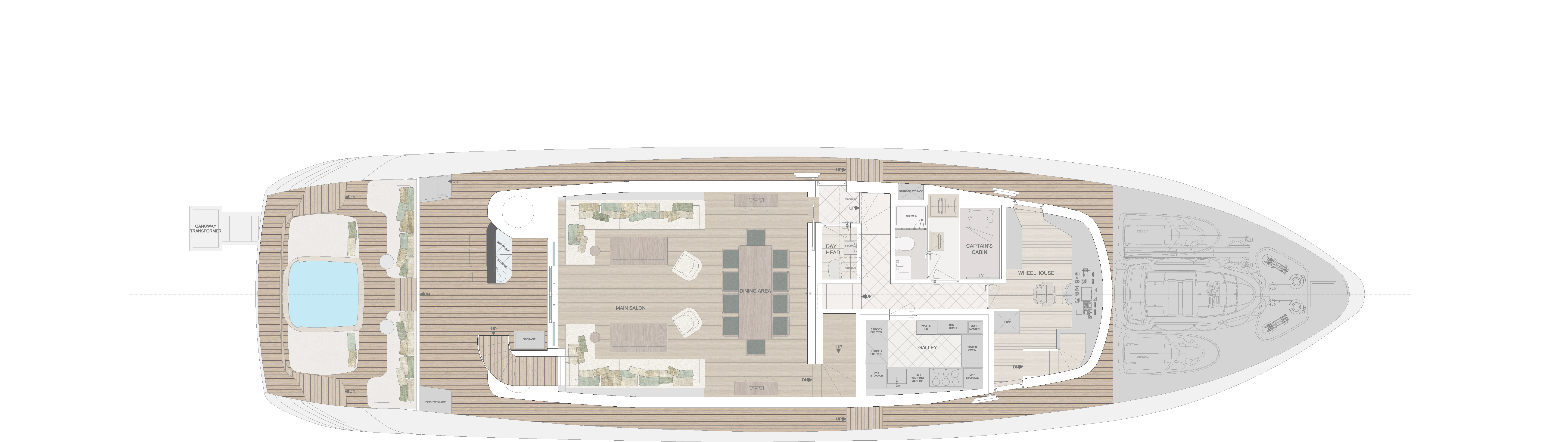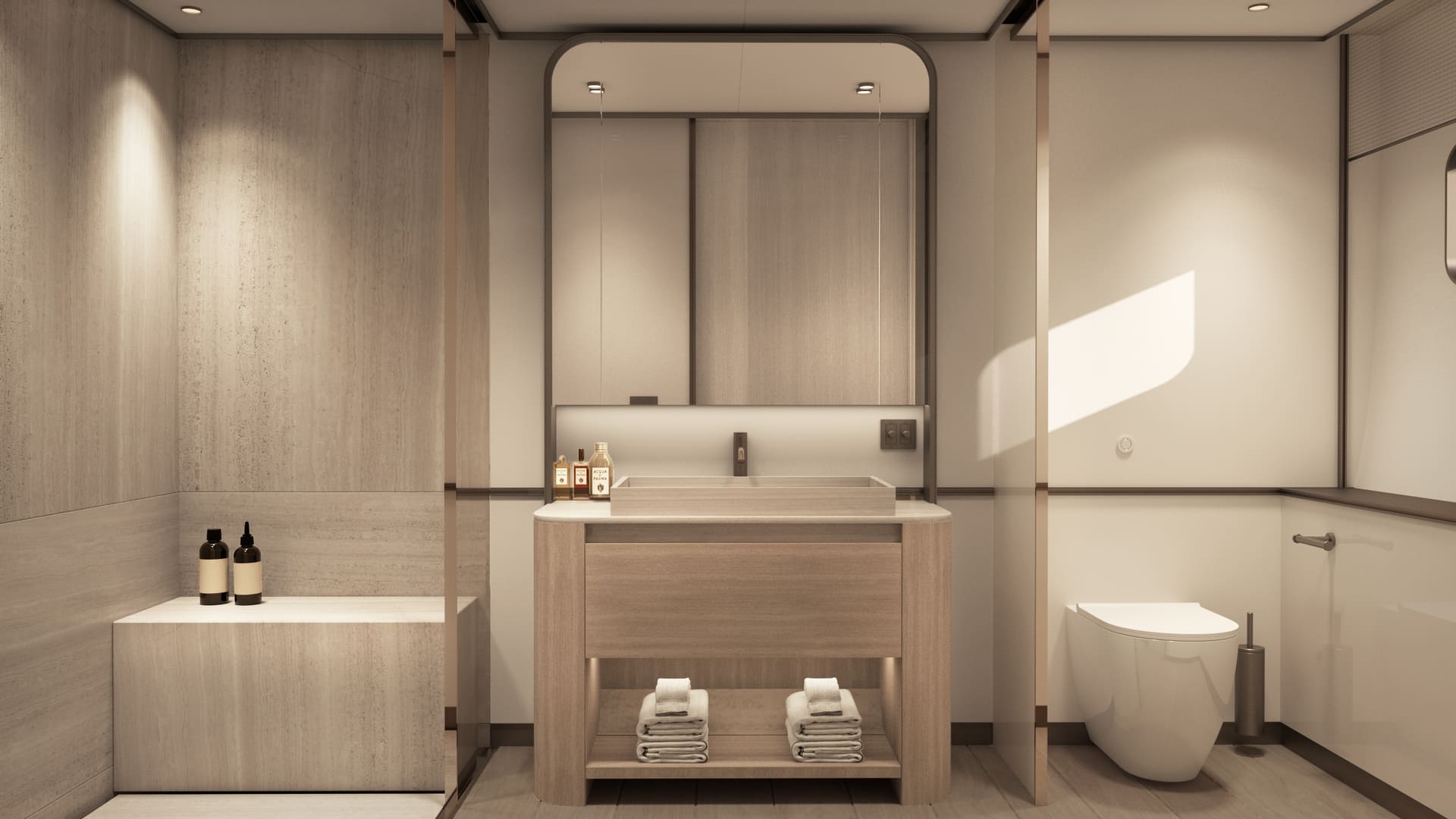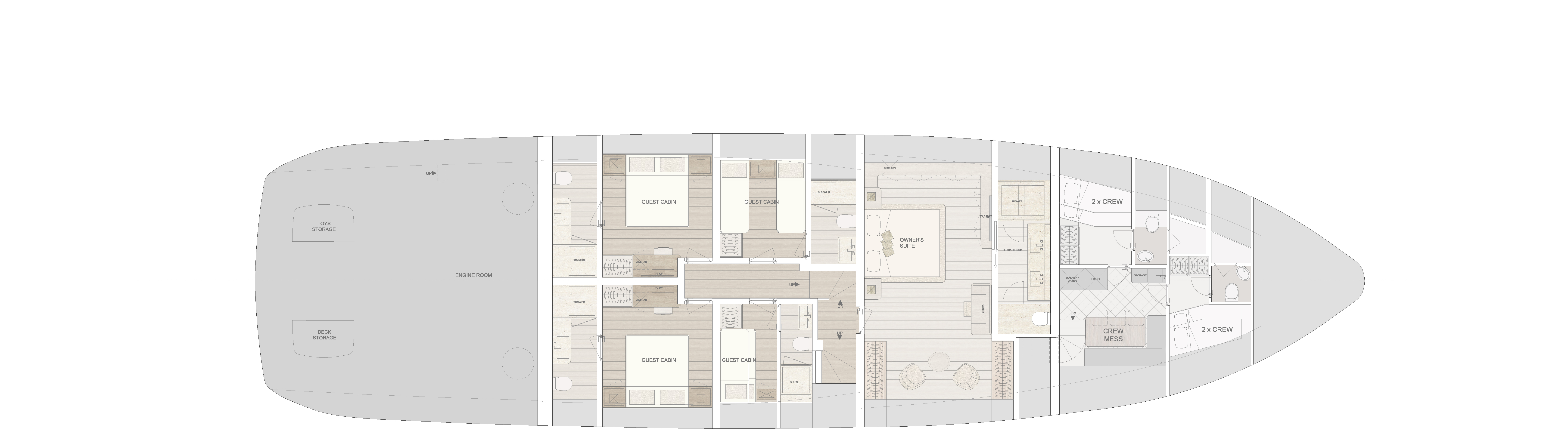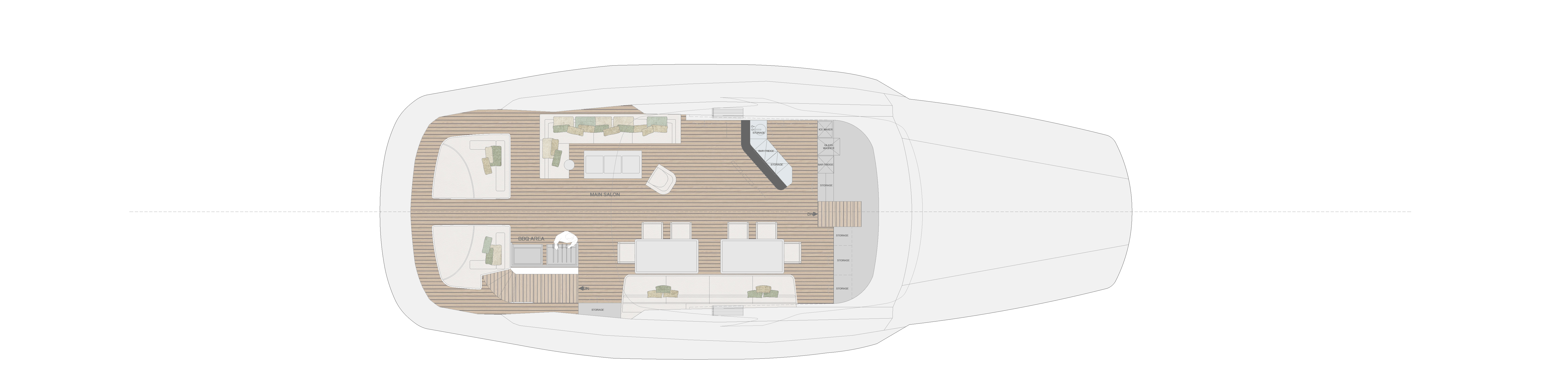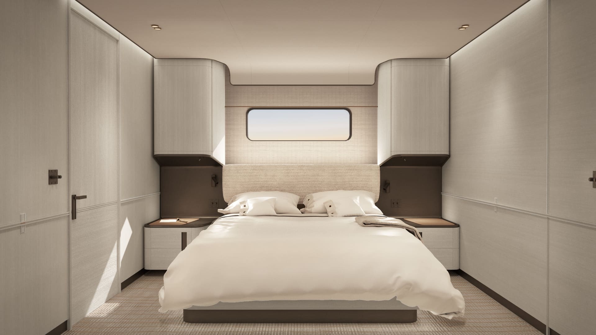 Nolimits超级游艇操刀的室内设计个性鲜明,与海洋元素和谐共鸣。从空间布局、选材用料到纹理刻画无不致敬自然之美,自然光线的引入更成为了别具一格的点睛之笔。犀利的几何元素与柔和的弧形元素相互交织,前卫的几何建筑与典雅的雕塑家具相映成辉,呈现出和谐与平衡之美。在选材方面以天然材料为主,特别是采用了突显艺术纹理和颗粒感的木材,以及折射光泽质感的拉丝金属、亚麻织物及丝绸壁纸。每处环境阴阳相成,每处细节引人入胜,见微知著彰显名不虚传的魅力。