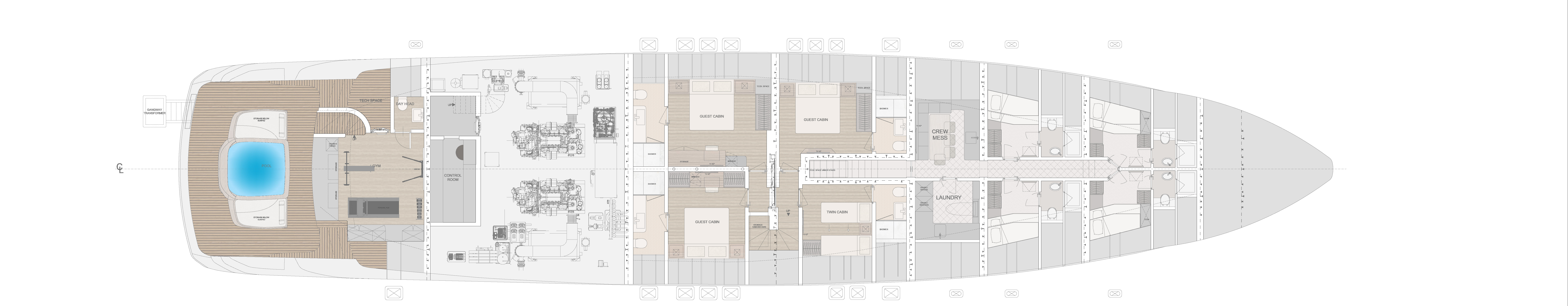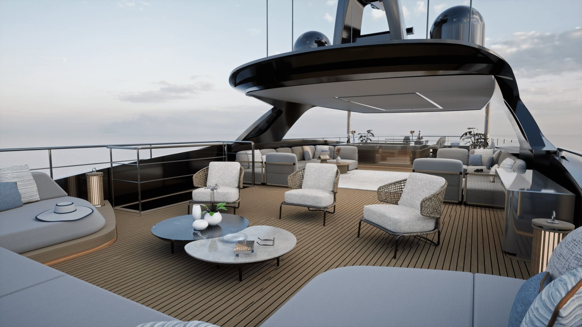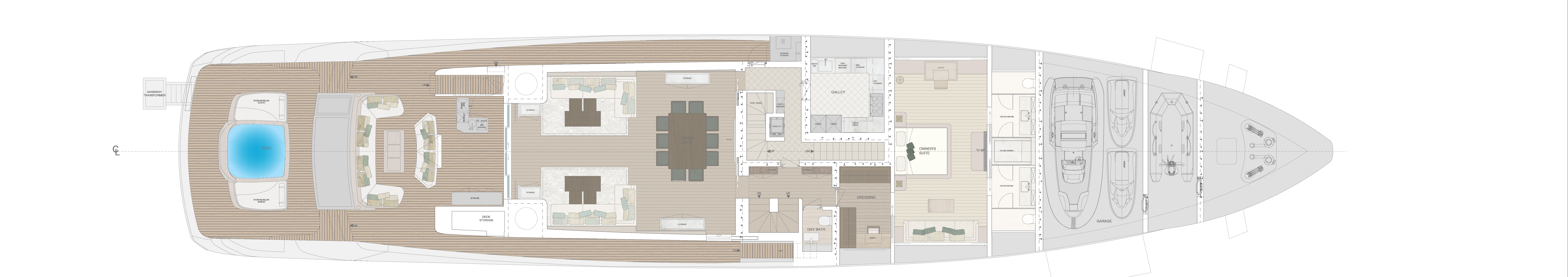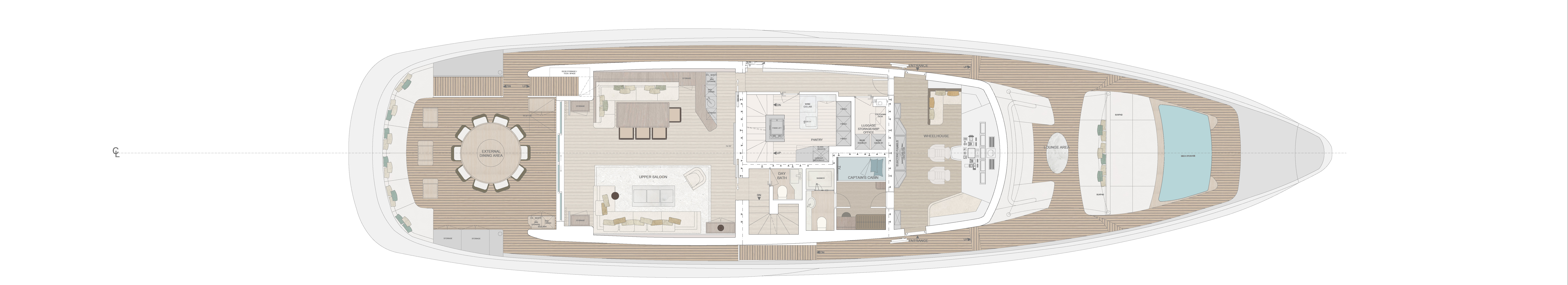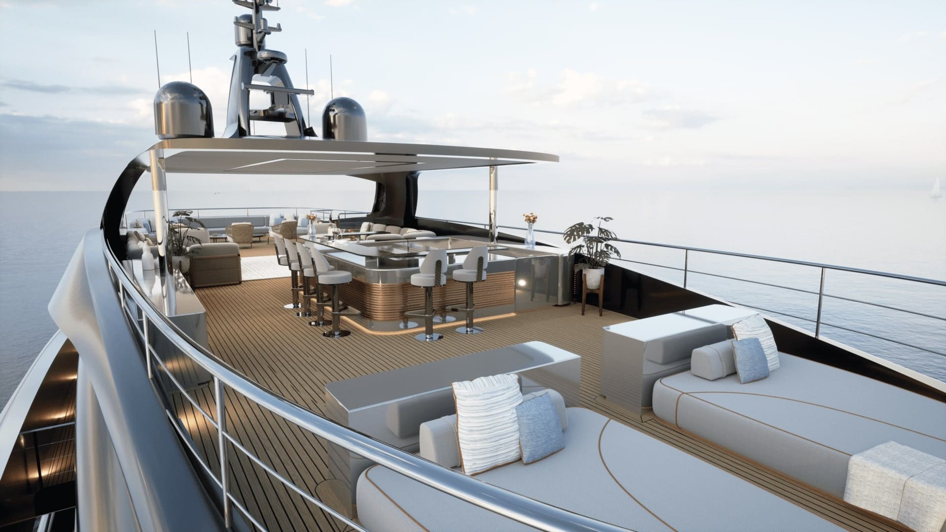 Nolimits 45作为一款三层甲板超级游艇,诠释了优雅与动感的平衡之道,彰显了刚柔并济的非凡之韵。大量玻璃设计实现了海天一线的光影之美,宽阔雅致的船艉与宏伟气派的船艏遥相呼应。上层建筑在飞桥甲板上以雄健气势直抵船艉,形成了一个别有洞天的驾驶区和日光浴区,无限海景风光在此尽收眼底。
