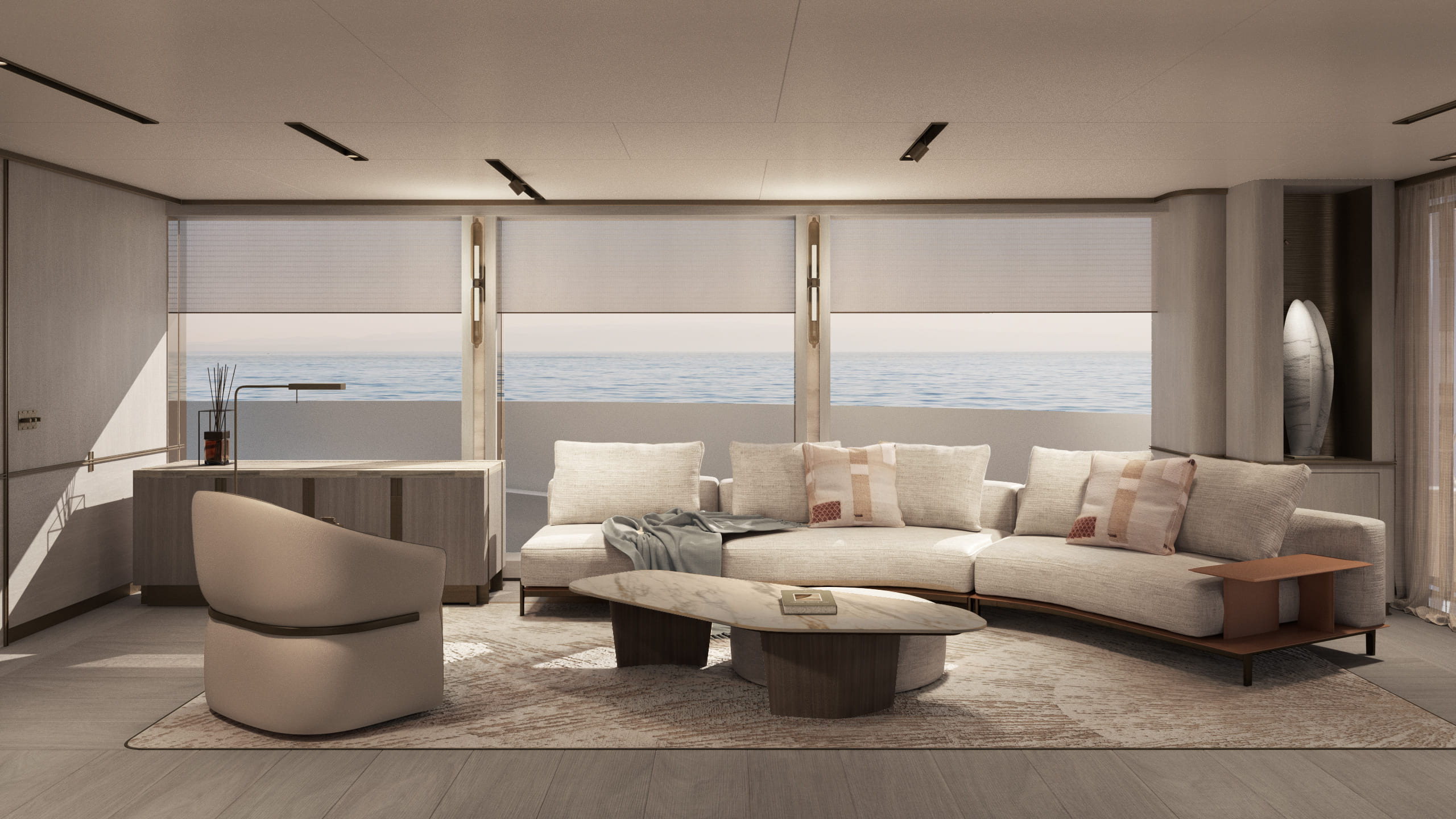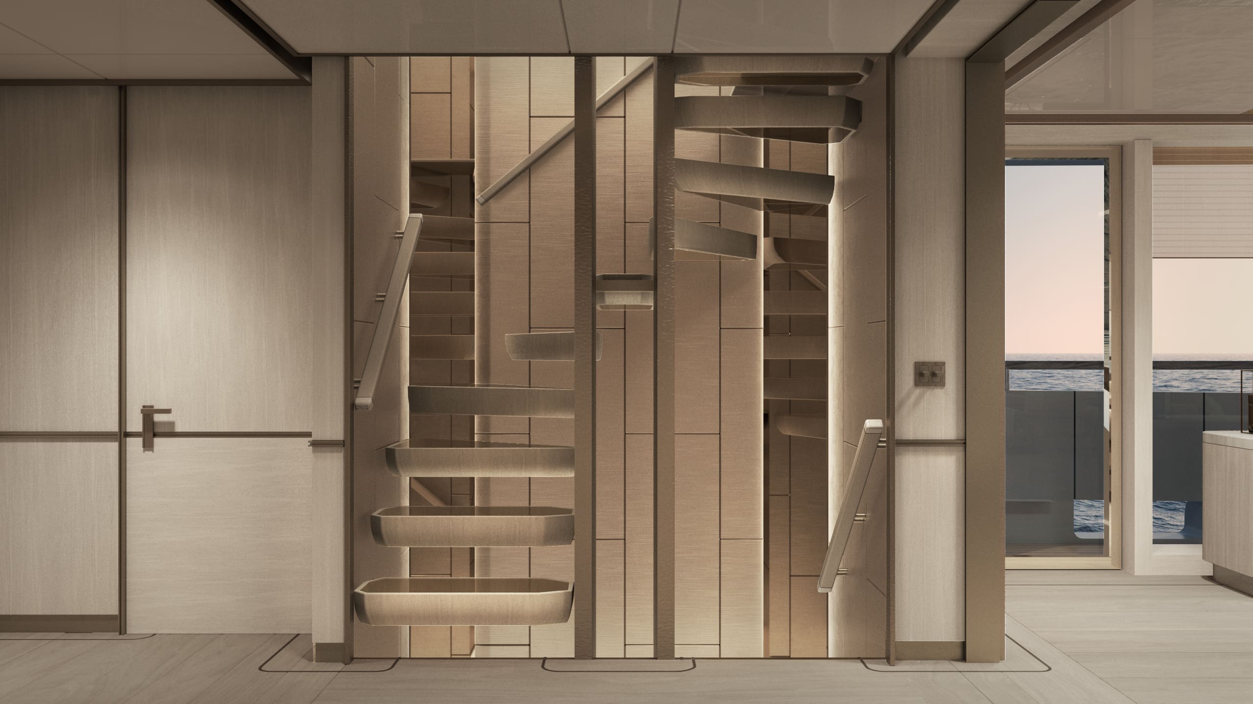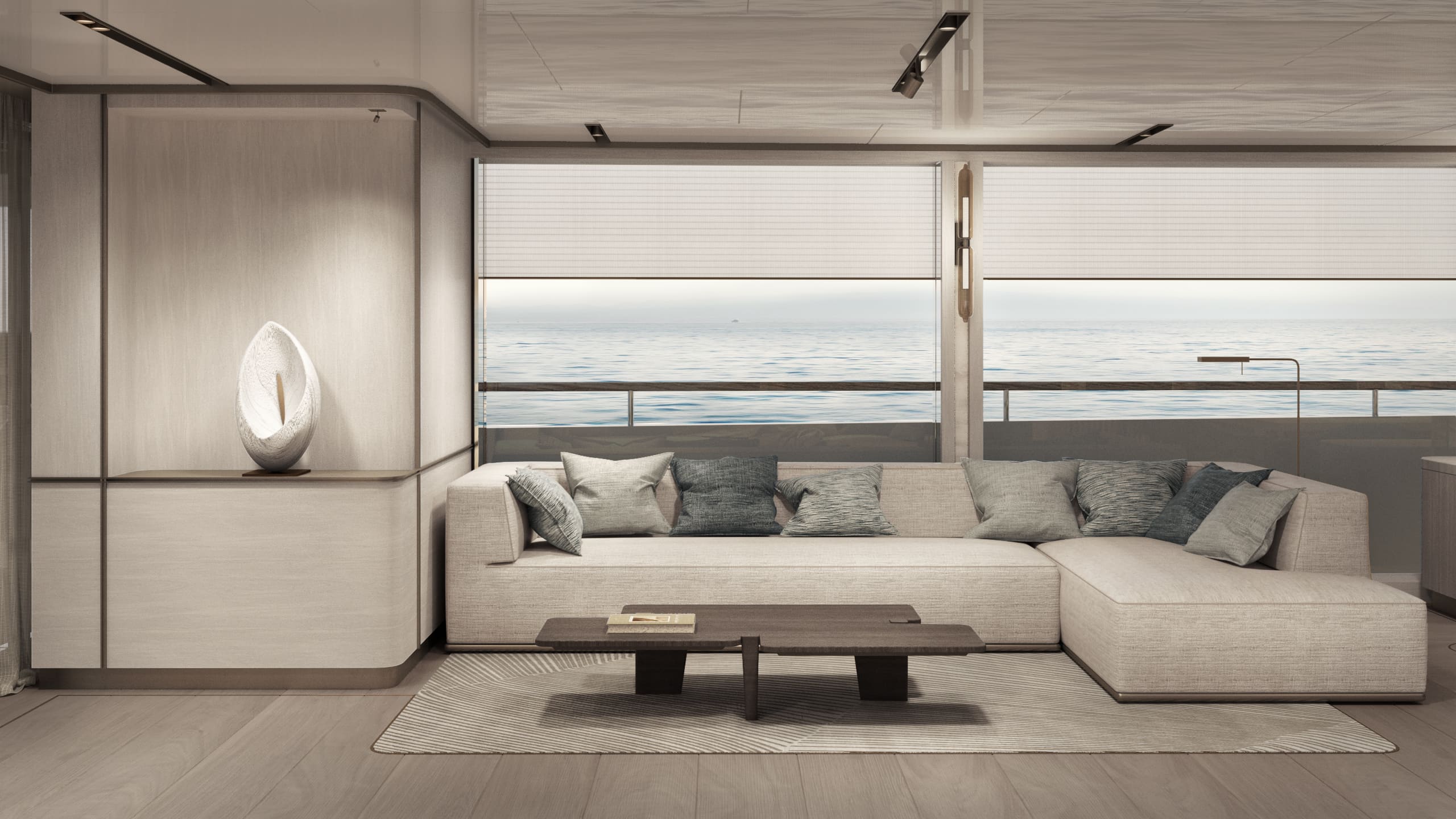 Touch Studio为Nolimits超级游艇操刀的室内设计个性鲜明,与海洋元素和谐共鸣。从空间布局、选材用料到纹理刻画无不致敬自然之美,自然光线的引入更成为了别具一格的点睛之笔。犀利的几何元素与柔和的弧形元素相互交织,前卫的几何建筑与典雅的雕塑家具相映成辉,呈现出和谐与平衡之美。在选材方面以天然材料为主,特别是采用了突显艺术纹理和颗粒感的木材,以及折射光泽质感的拉丝金属、亚麻织物及丝绸壁纸。每处环境阴阳相成,每处细节引人入胜,见微知著彰显名不虚传的魅力。