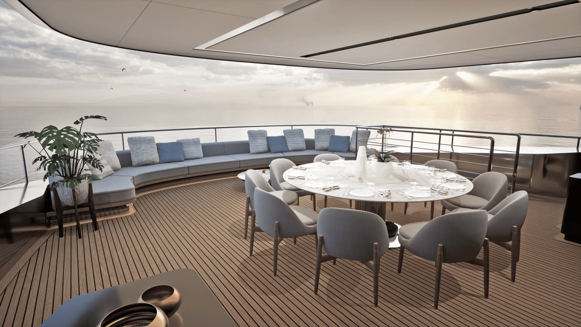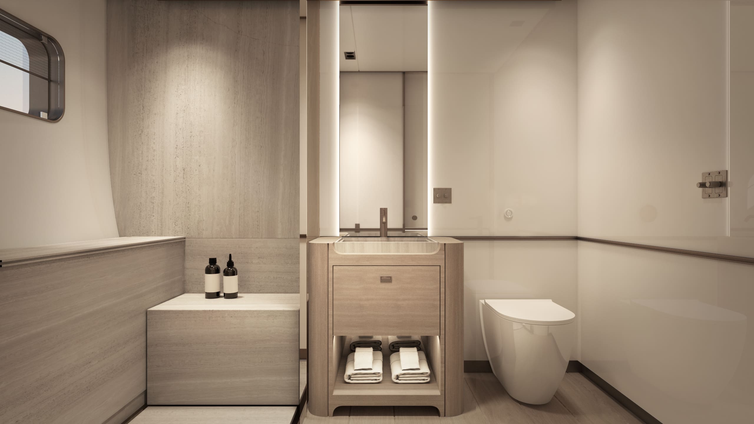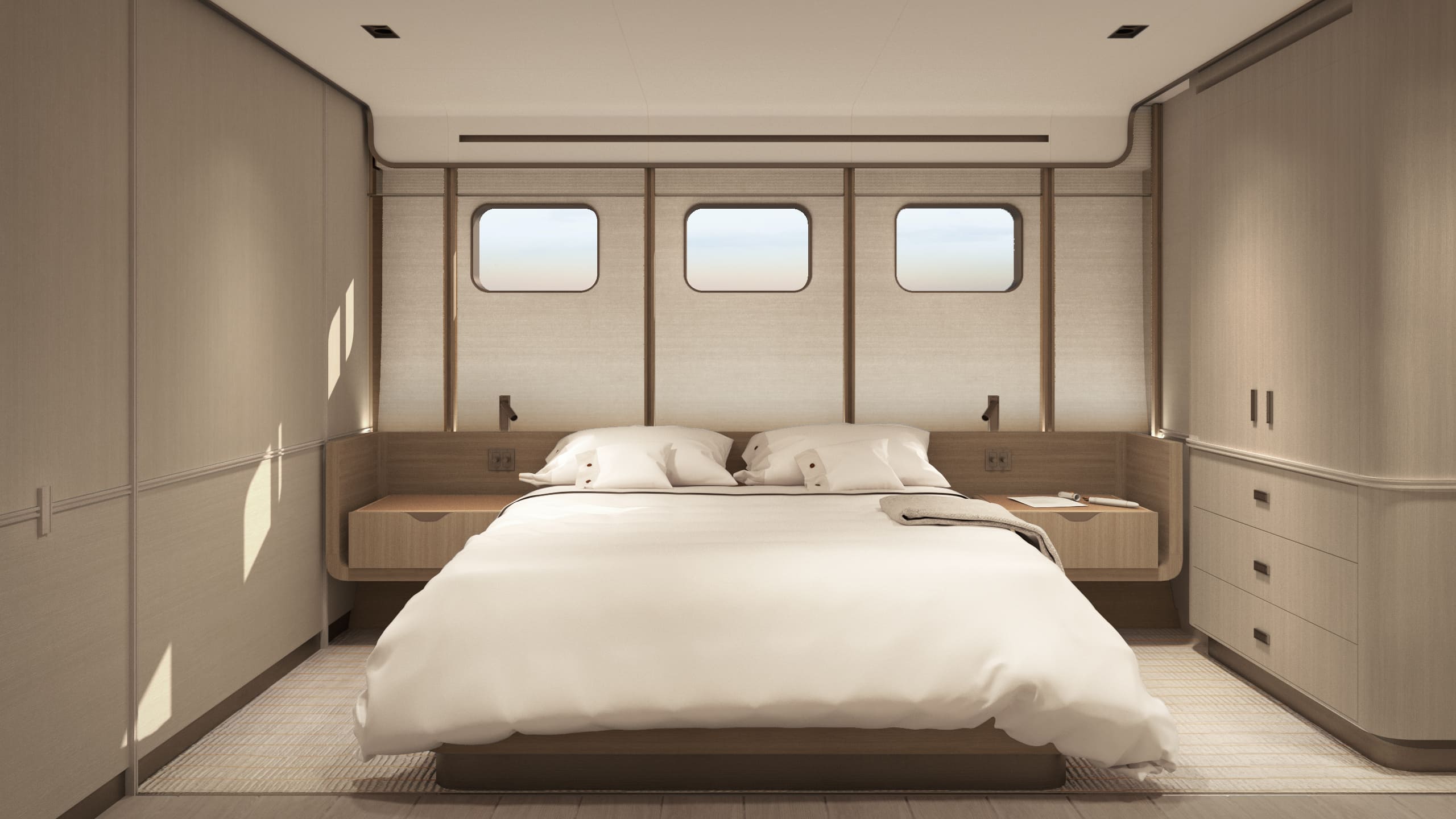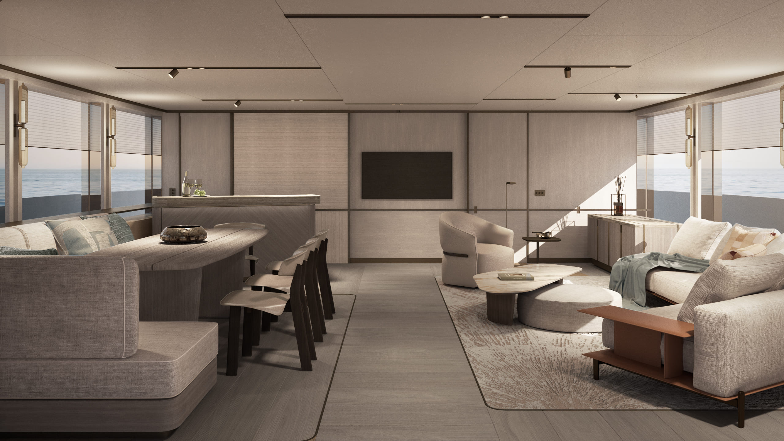 Touch Studio为Nolimits超级游艇操刀的室内设计个性鲜明,与海洋元素和谐共鸣。从空间布局、选材用料到纹理刻画无不致敬自然之美,自然光线的引入更成为了别具一格的点睛之笔。犀利的几何元素与柔和的弧形元素相互交织,前卫的几何建筑与典雅的雕塑家具相映成辉,呈现出和谐与平衡之美。在选材方面以天然材料为主,特别是采用了突显艺术纹理和颗粒感的木材,以及折射光泽质感的拉丝金属、亚麻织物及丝绸壁纸。每处环境阴阳相成,每处细节引人入胜,见微知著彰显名不虚传的魅力。